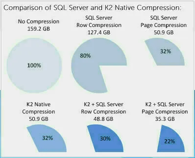 Native Data Compression – K2’s compression saves two-thirds of database capacity — matching best-case SQL Server compression with no additional load on database server CPUs